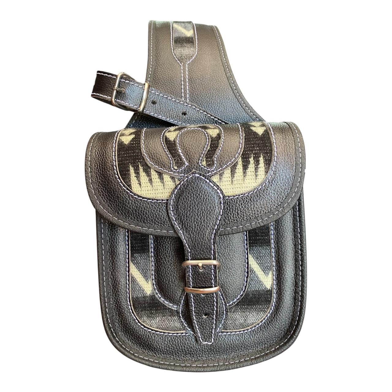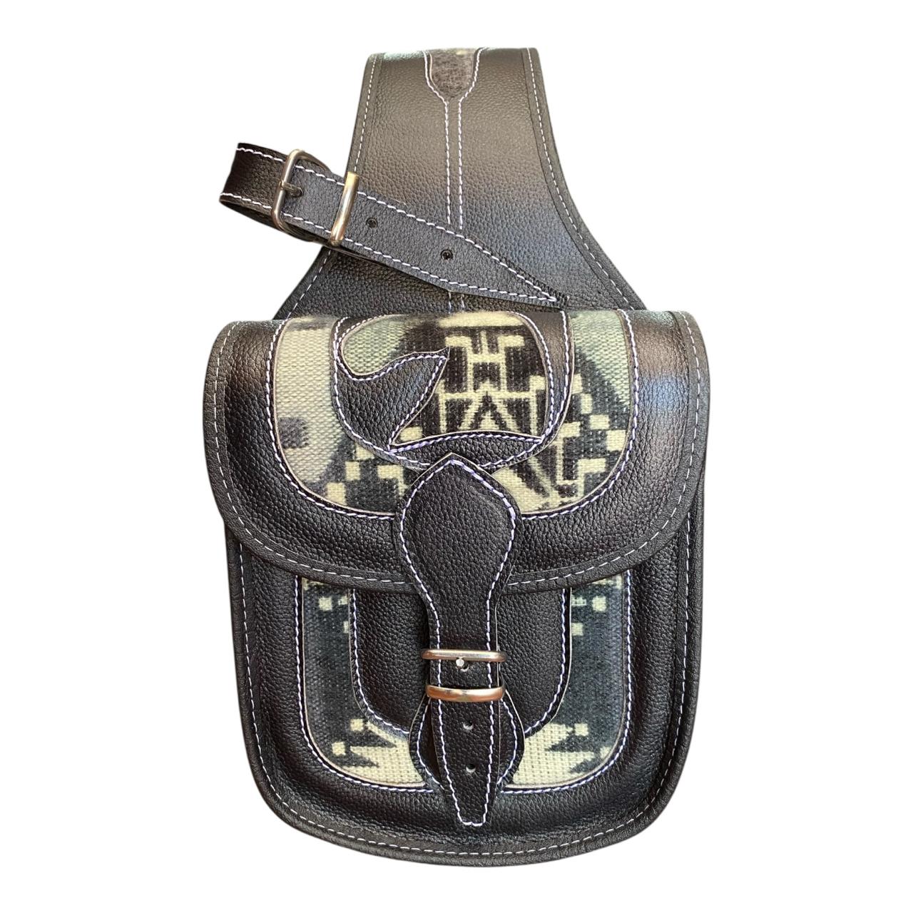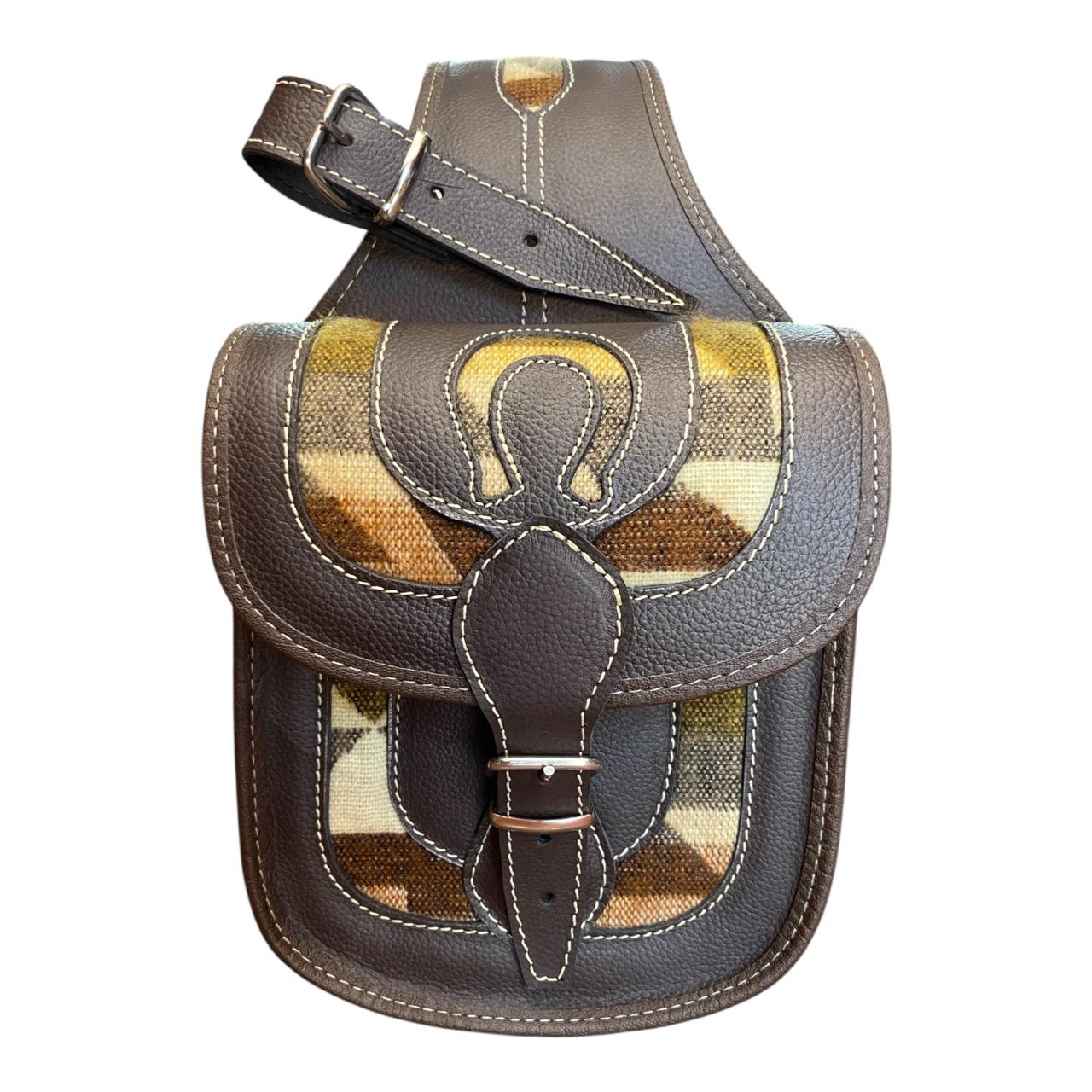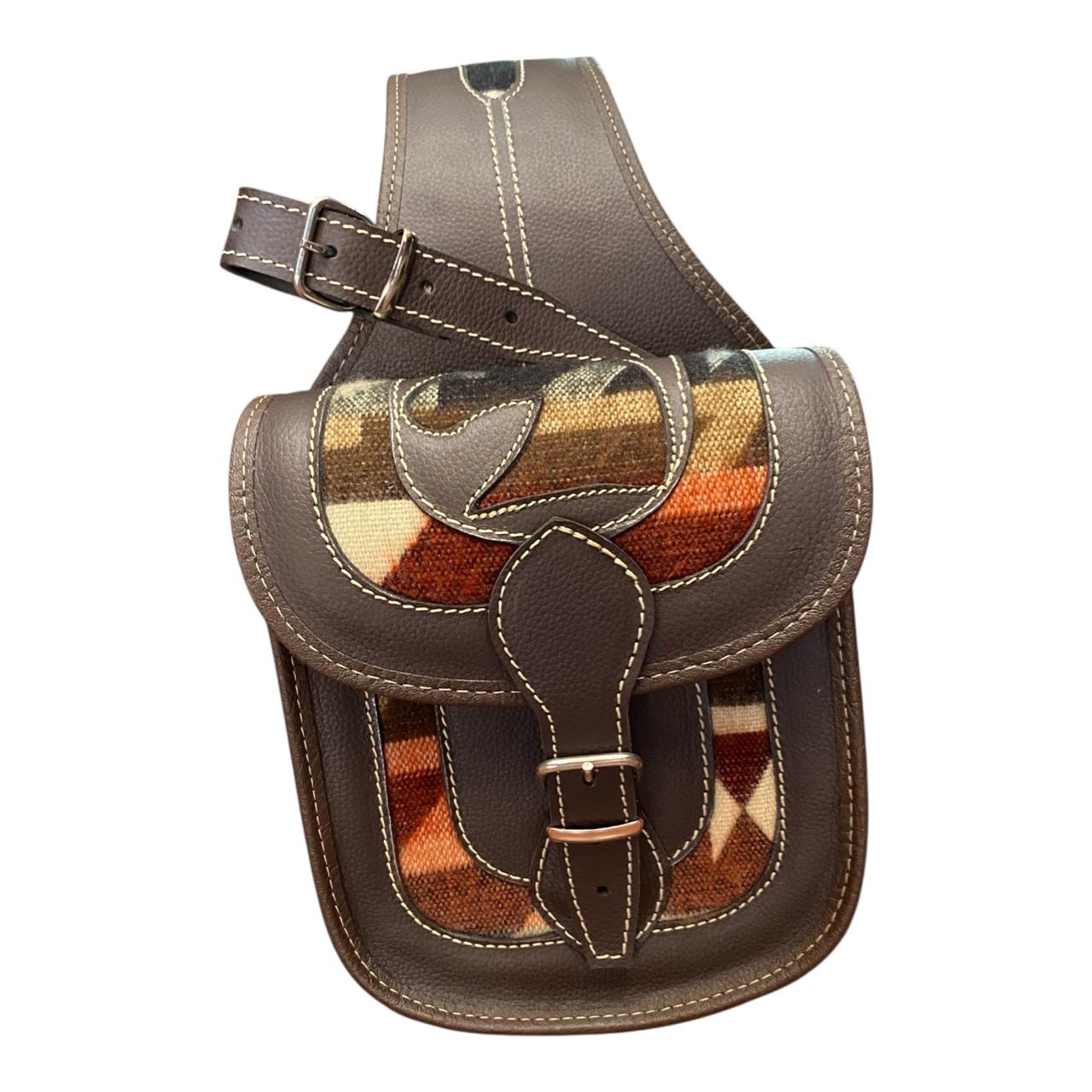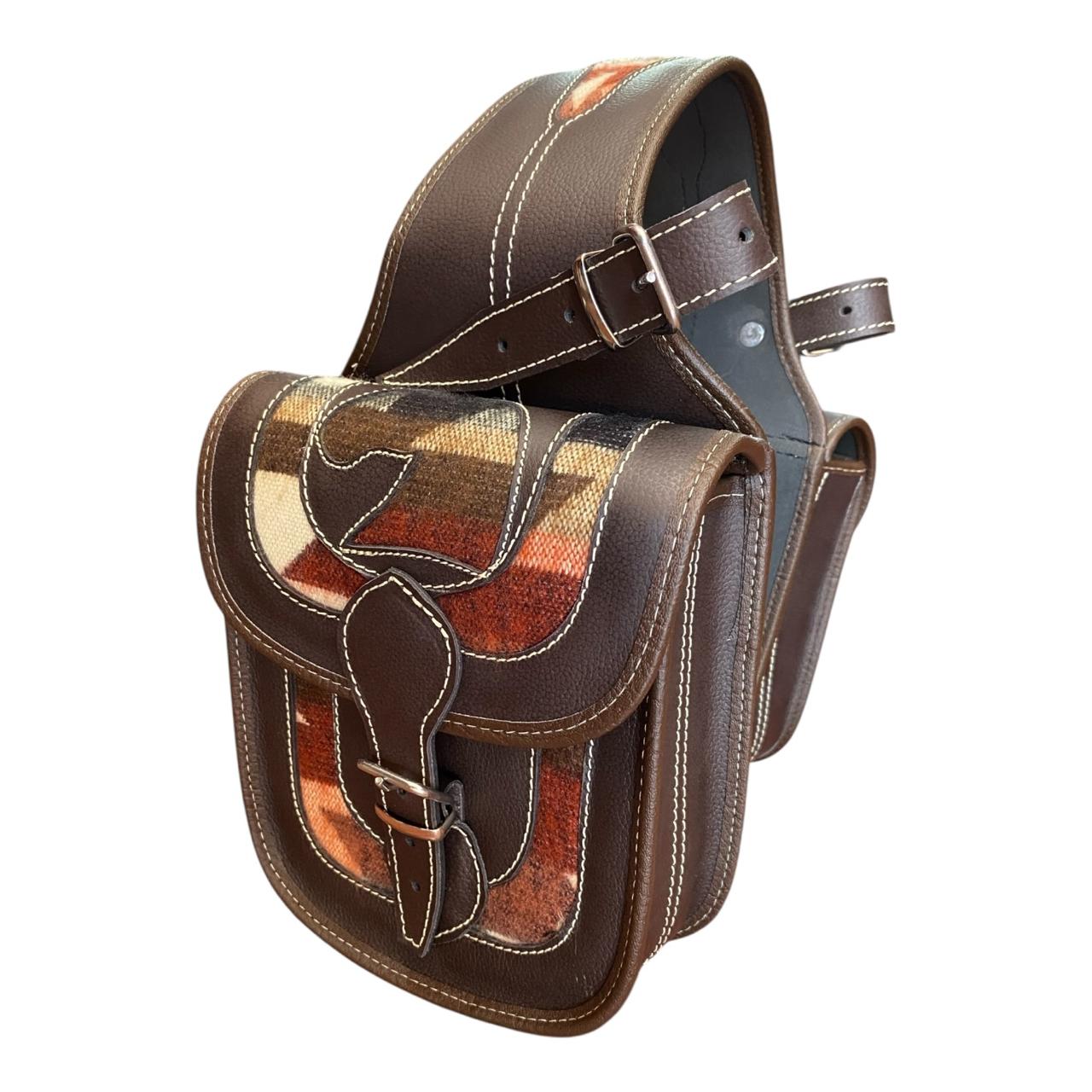 Exterior en cuero delgado resistente, interior forrado con cuero vegano y apliques decorativos en tela zarape de alta calidad.