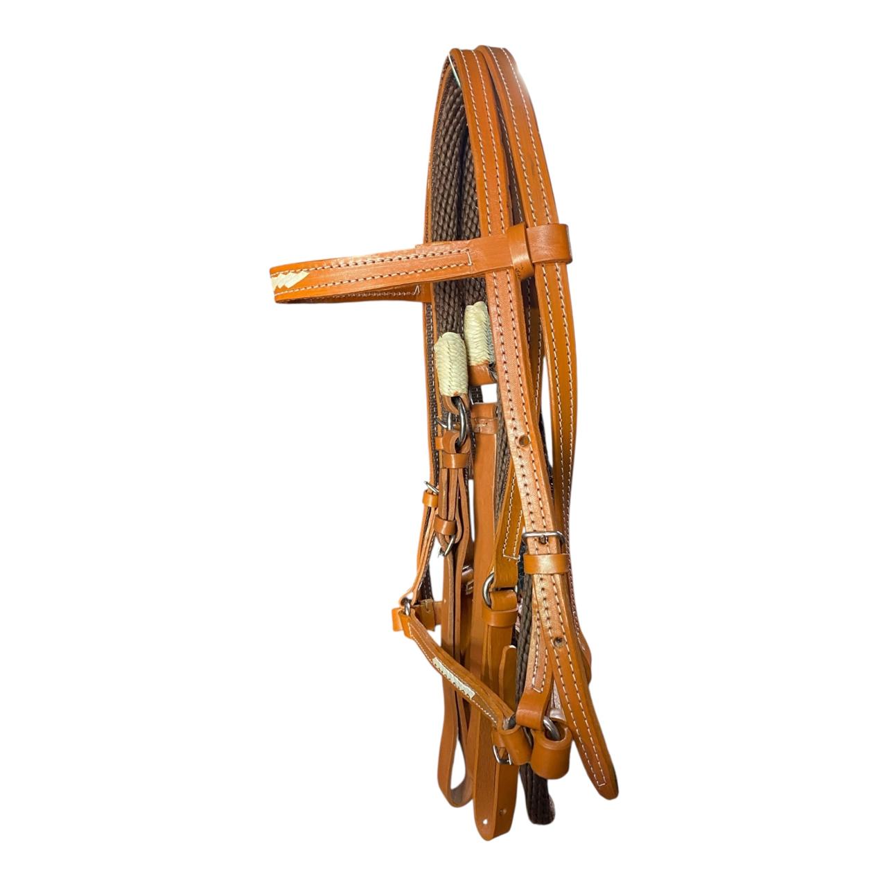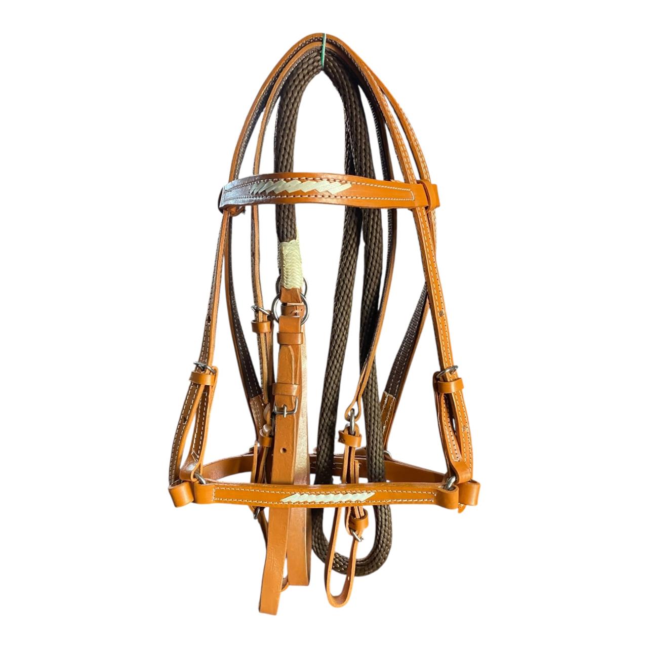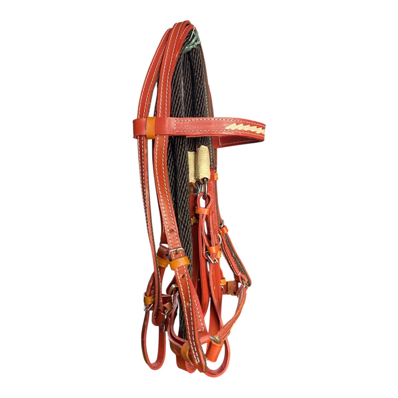 Detalle de Cuerda Envuelta (Nariguera/Muserola): En la unión entre las carrilleras y la muserola, hay un detalle notable de cuerda más fina, de color blanco o crema, que se encuentra enrollada o tejida alrededor de las correas de cuero. Este elemento puede funcionar como un tope o refuerzo, además de ser un adorno estético.