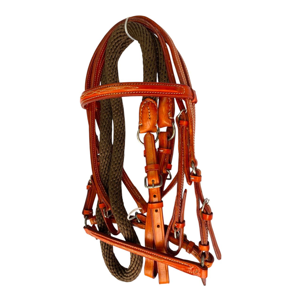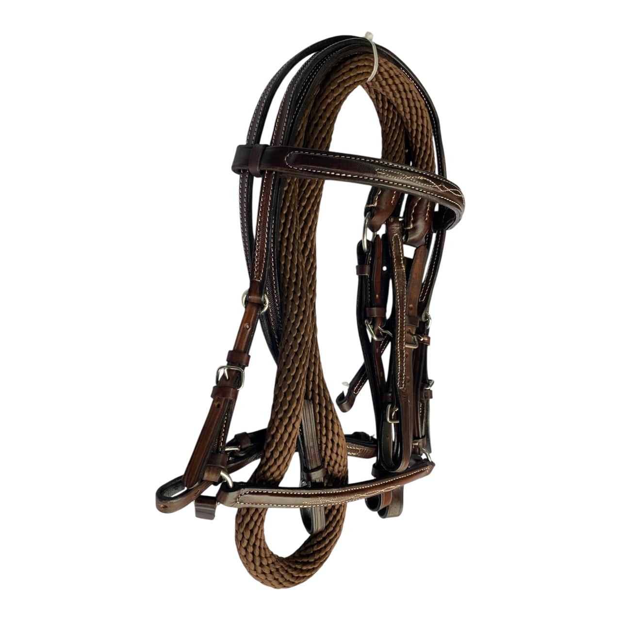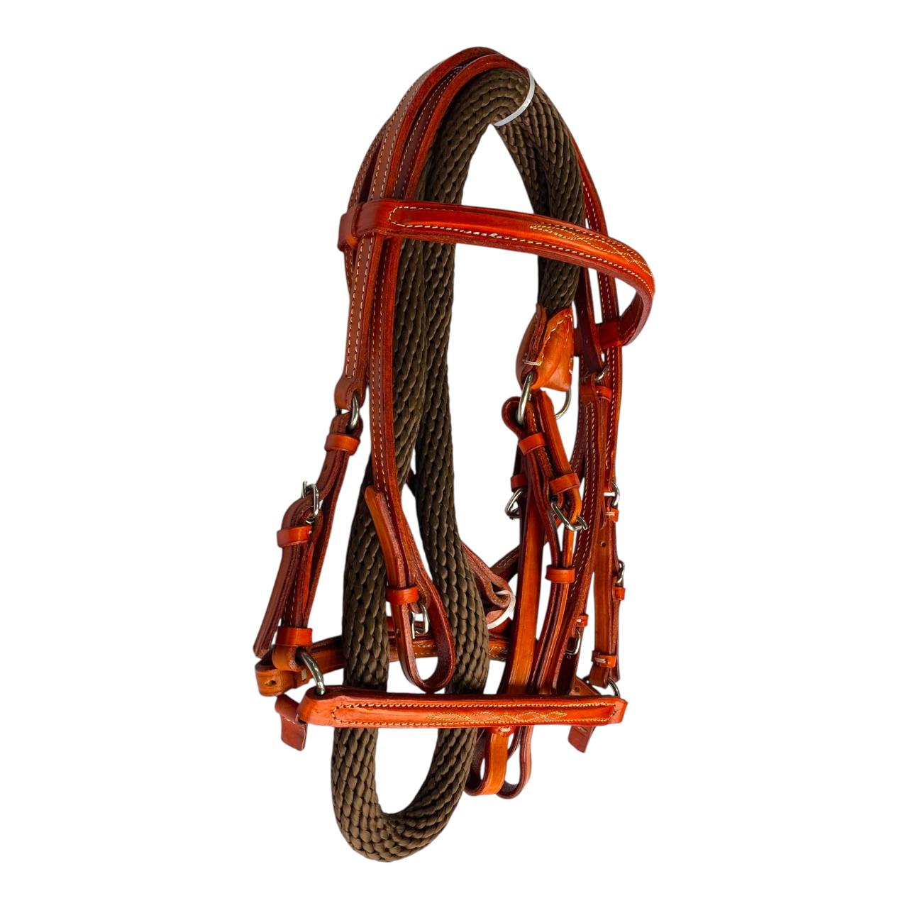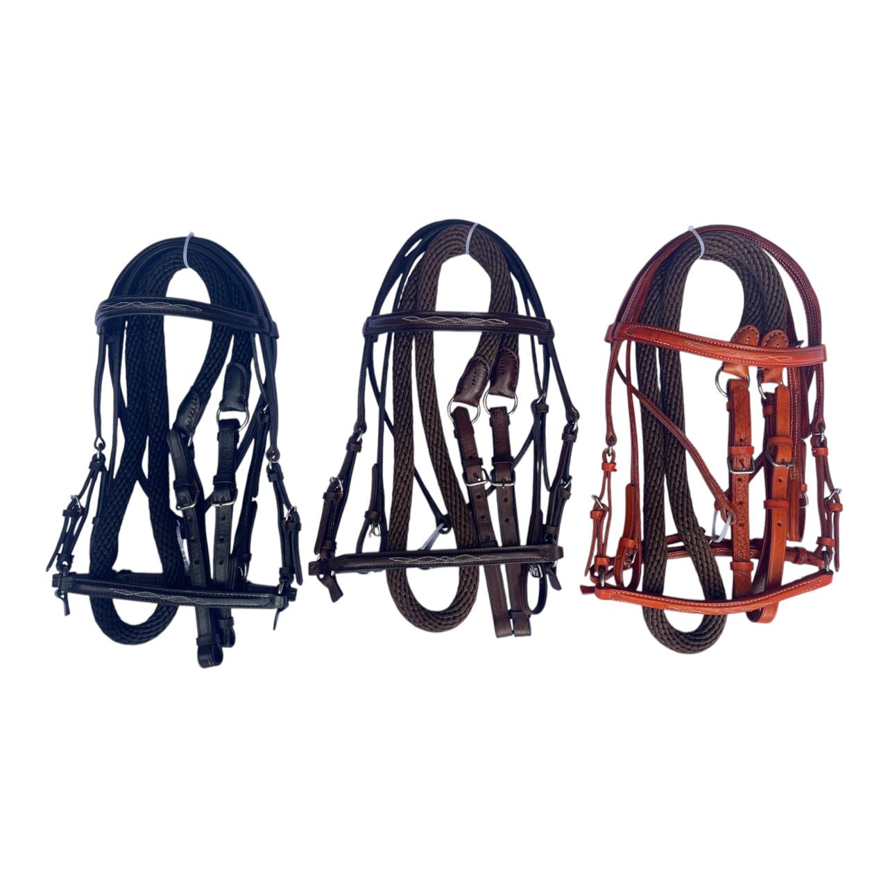 Nuestro Apero de cabeza fino en cuero tejido a mano, viene con jaquima, cabezada en cuero y rienda calibre 18, herraje es en acero inoxidable. Este apero de cabeza es perfecto para un día de paseo o cabalgata.