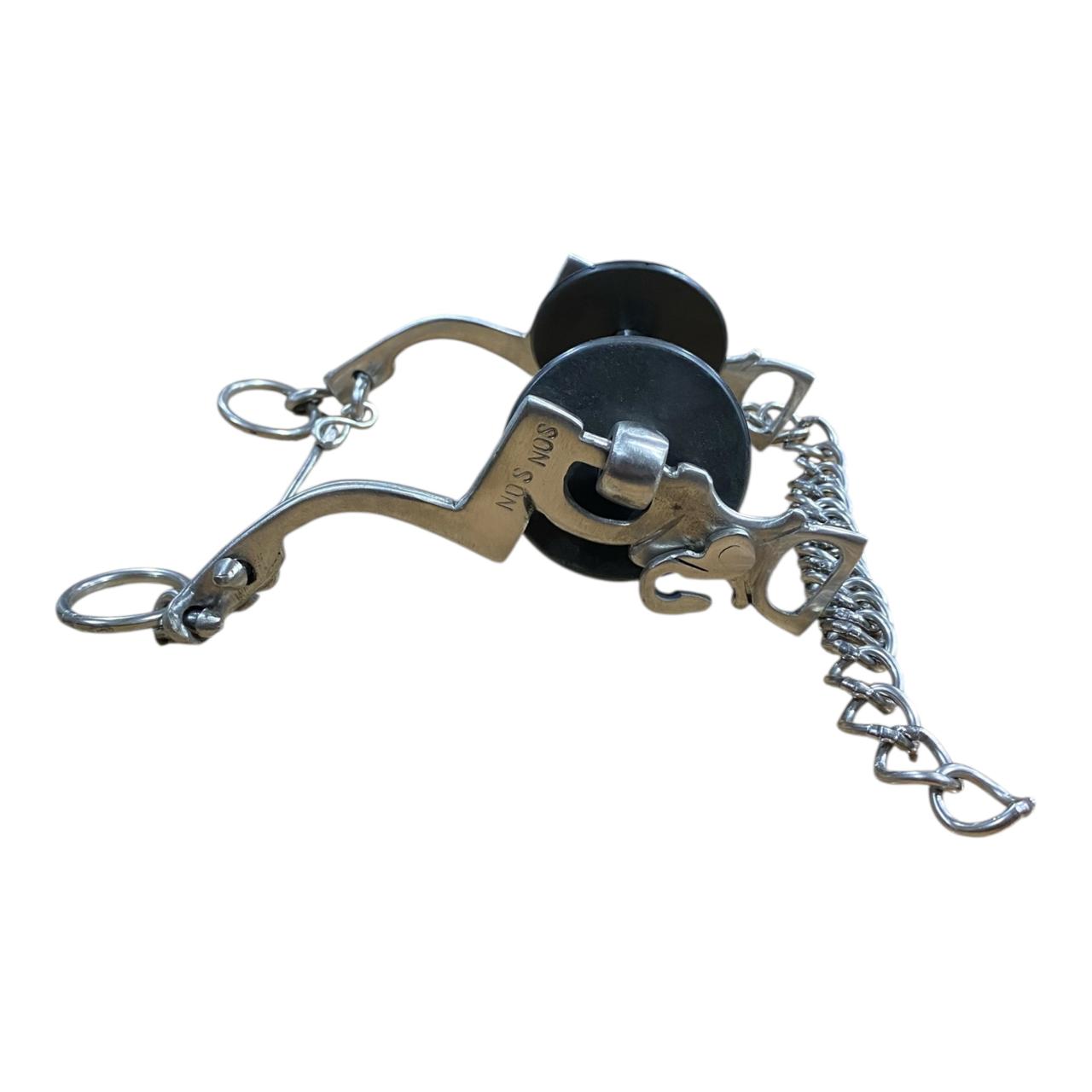 - El bocado se articula en el centro. Al aplicar presión con las riendas, el freno ejerce una acción de “cascanueces” sobre la lengua y las barras de la boca.