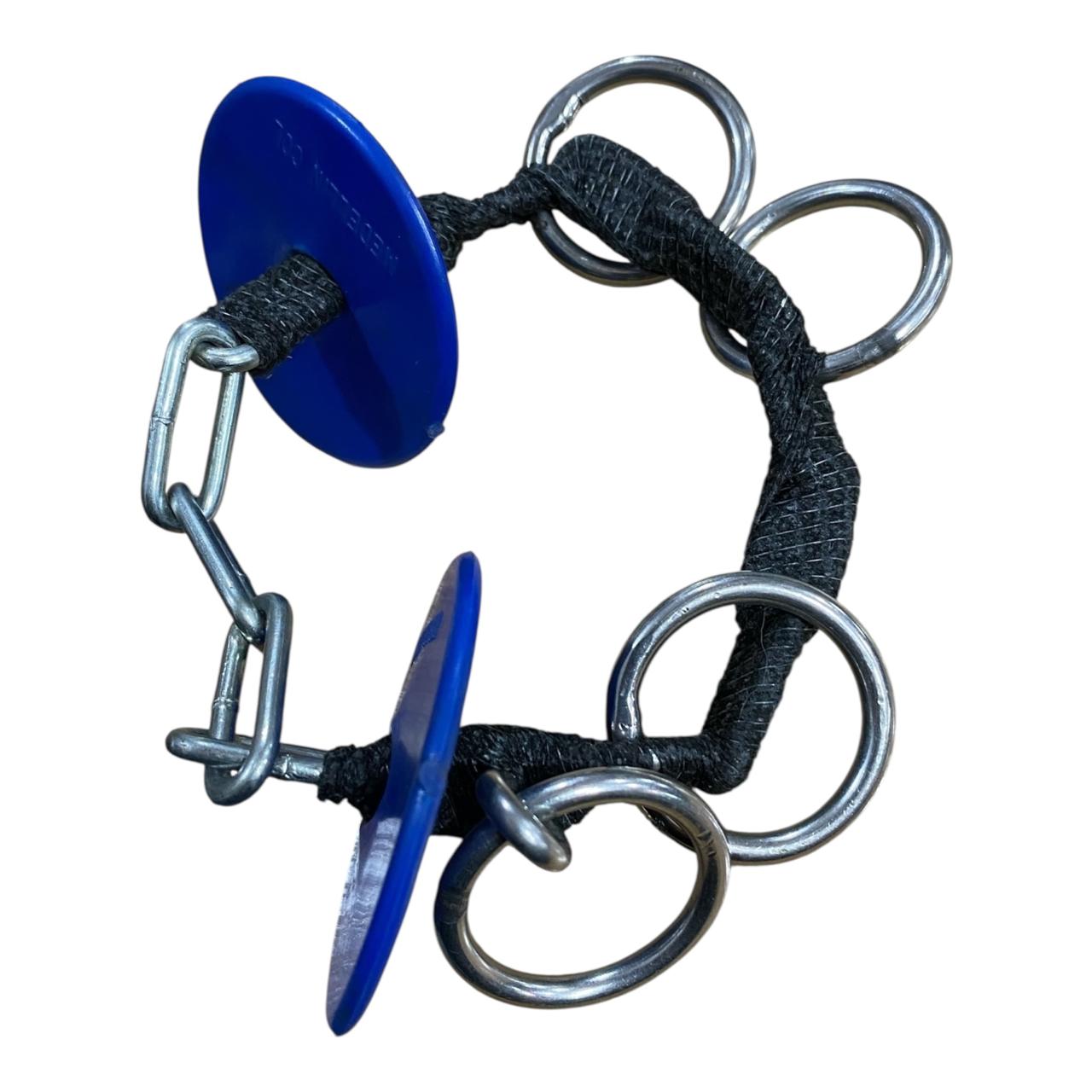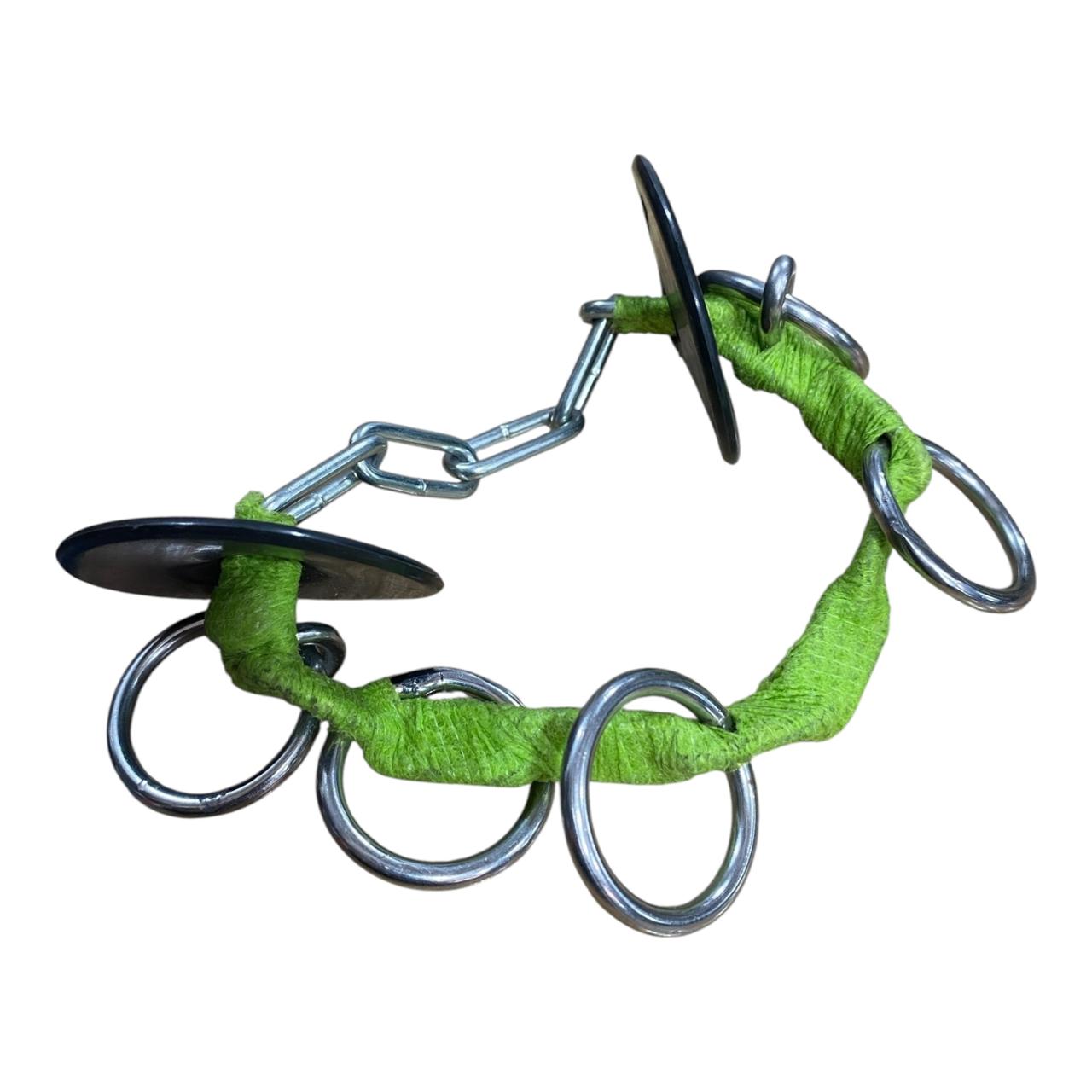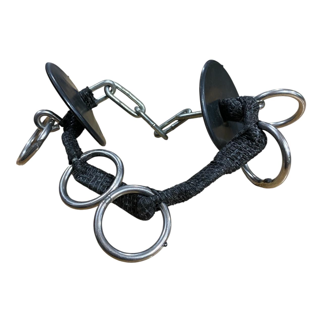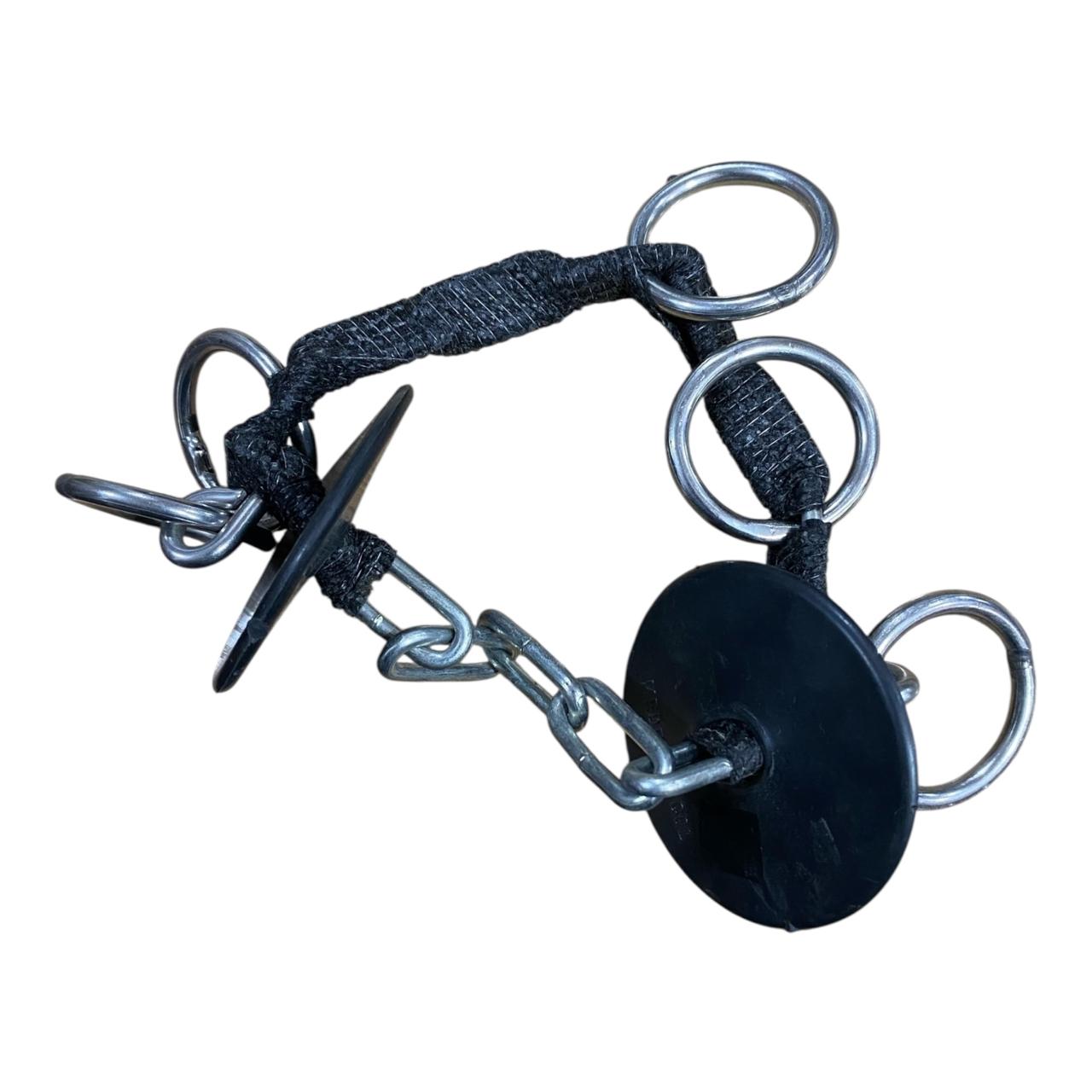 La sección central está envuelta en una venda Cobán suave que minimiza el roce directo en el hocico o barbilla del caballo, pero mantiene la solidez y el control de la cadena. Los múltiples anillos ofrecen varios puntos de enganche para la cuerda de mano, permitiendo al manejador elegir el nivel de palanca deseado.