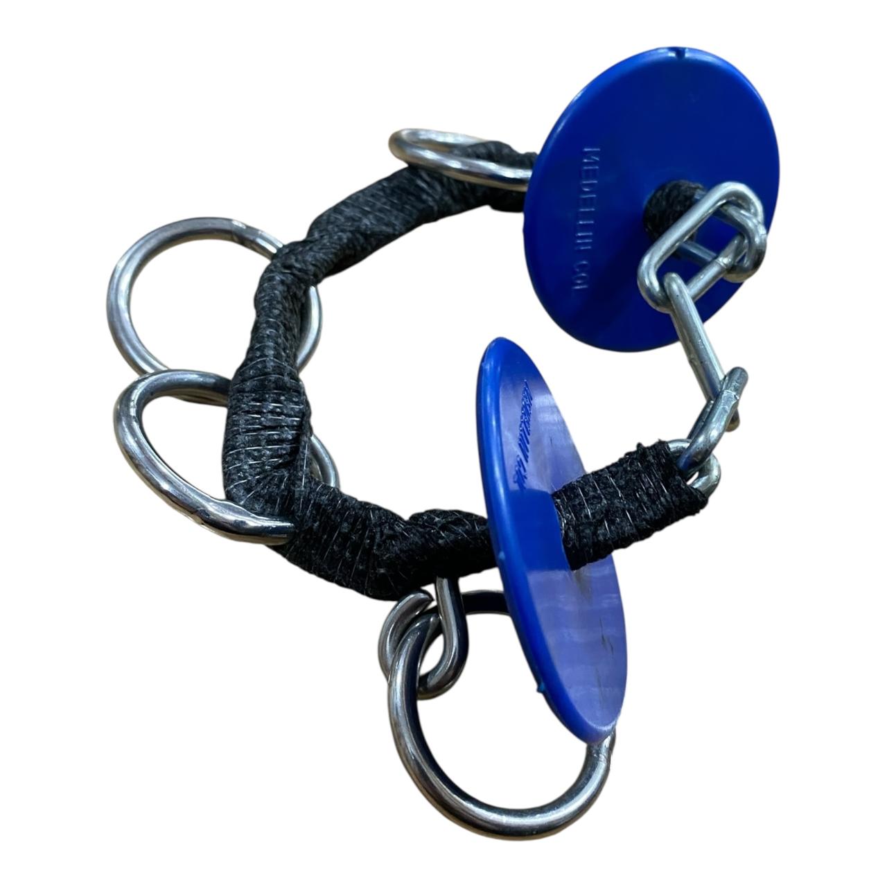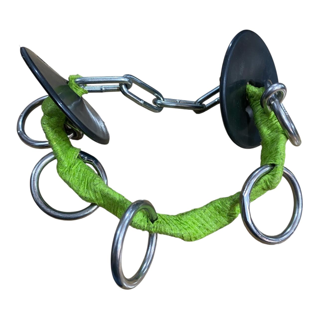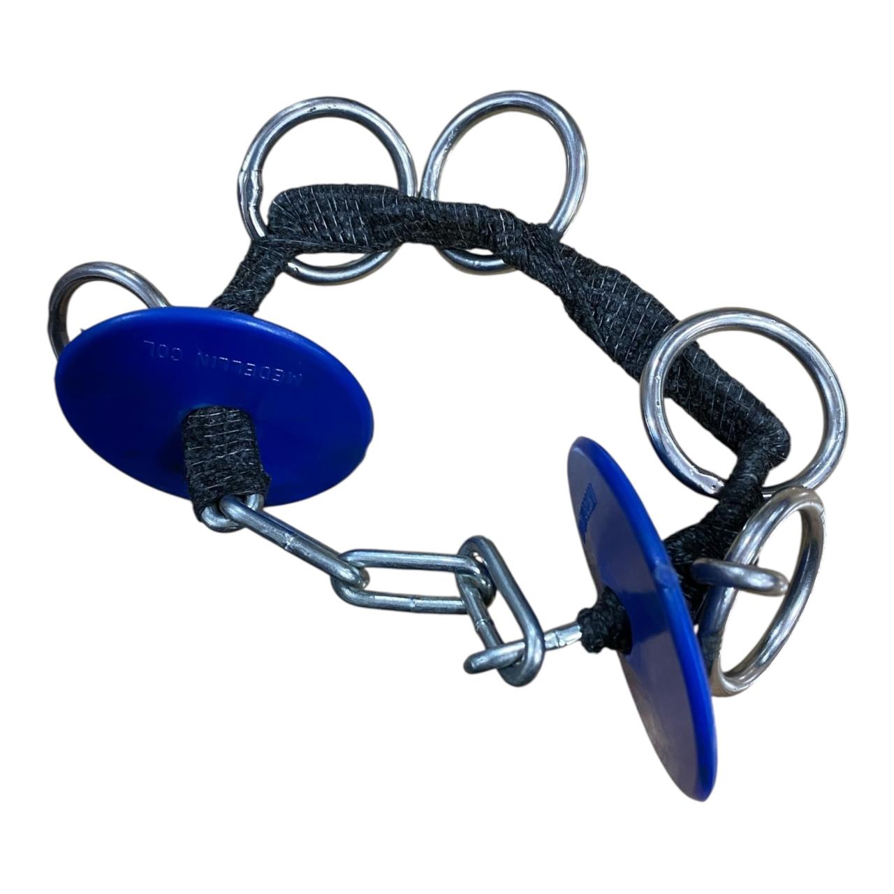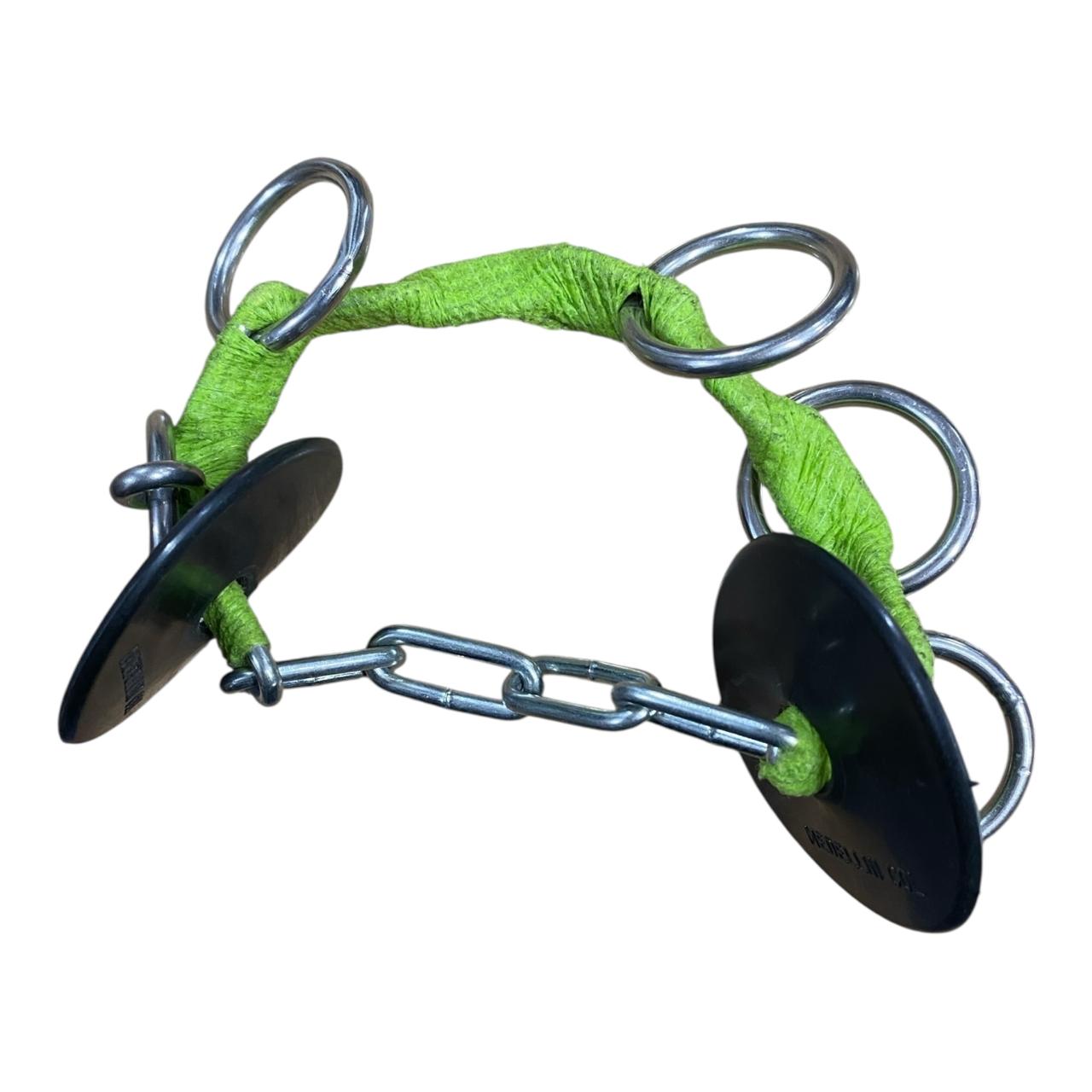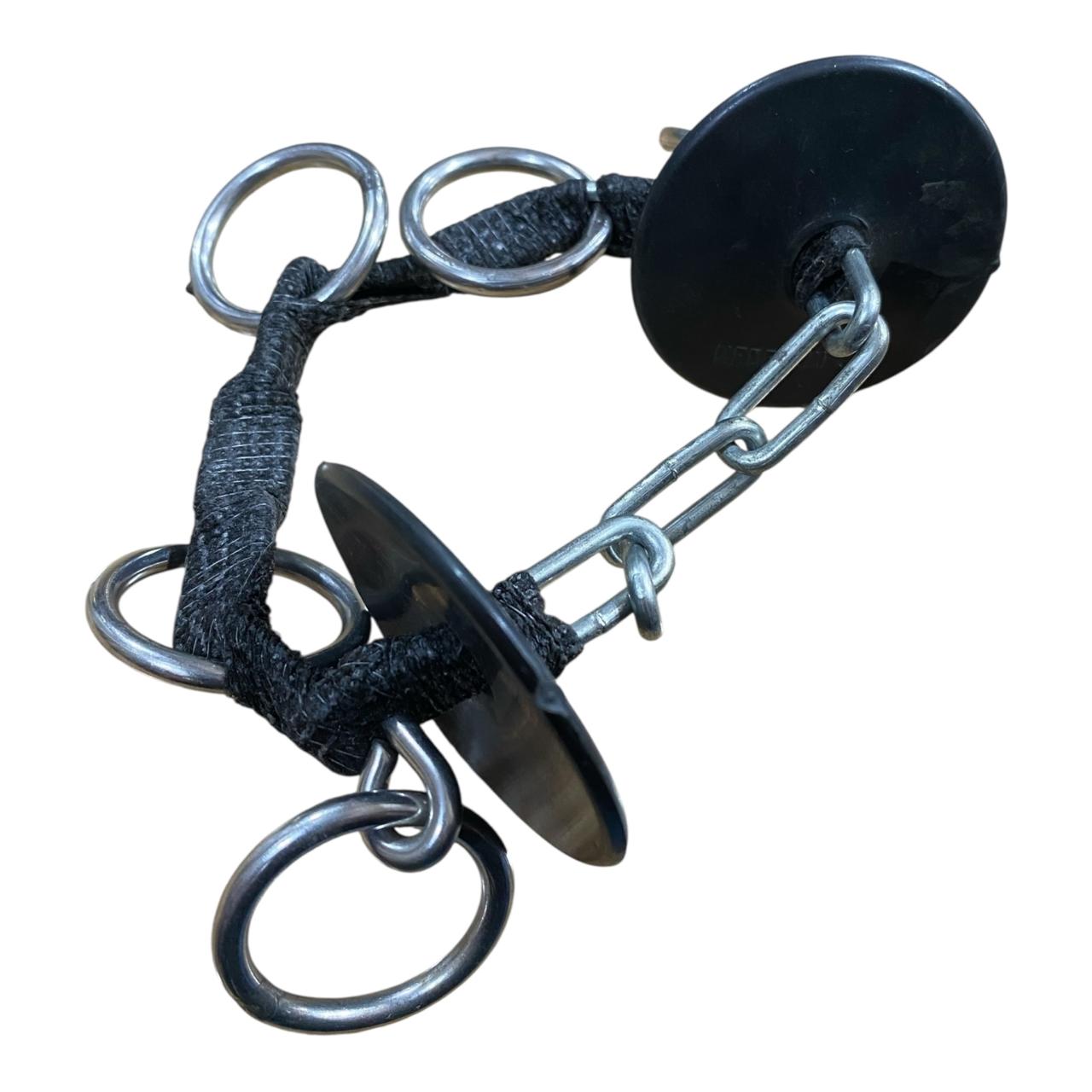 La sección central está envuelta en una venda Cobán suave que minimiza el roce directo en el hocico o barbilla del caballo, pero mantiene la solidez y el control de la cadena. Los múltiples anillos ofrecen varios puntos de enganche para la cuerda de mano, permitiendo al manejador elegir el nivel de palanca deseado.