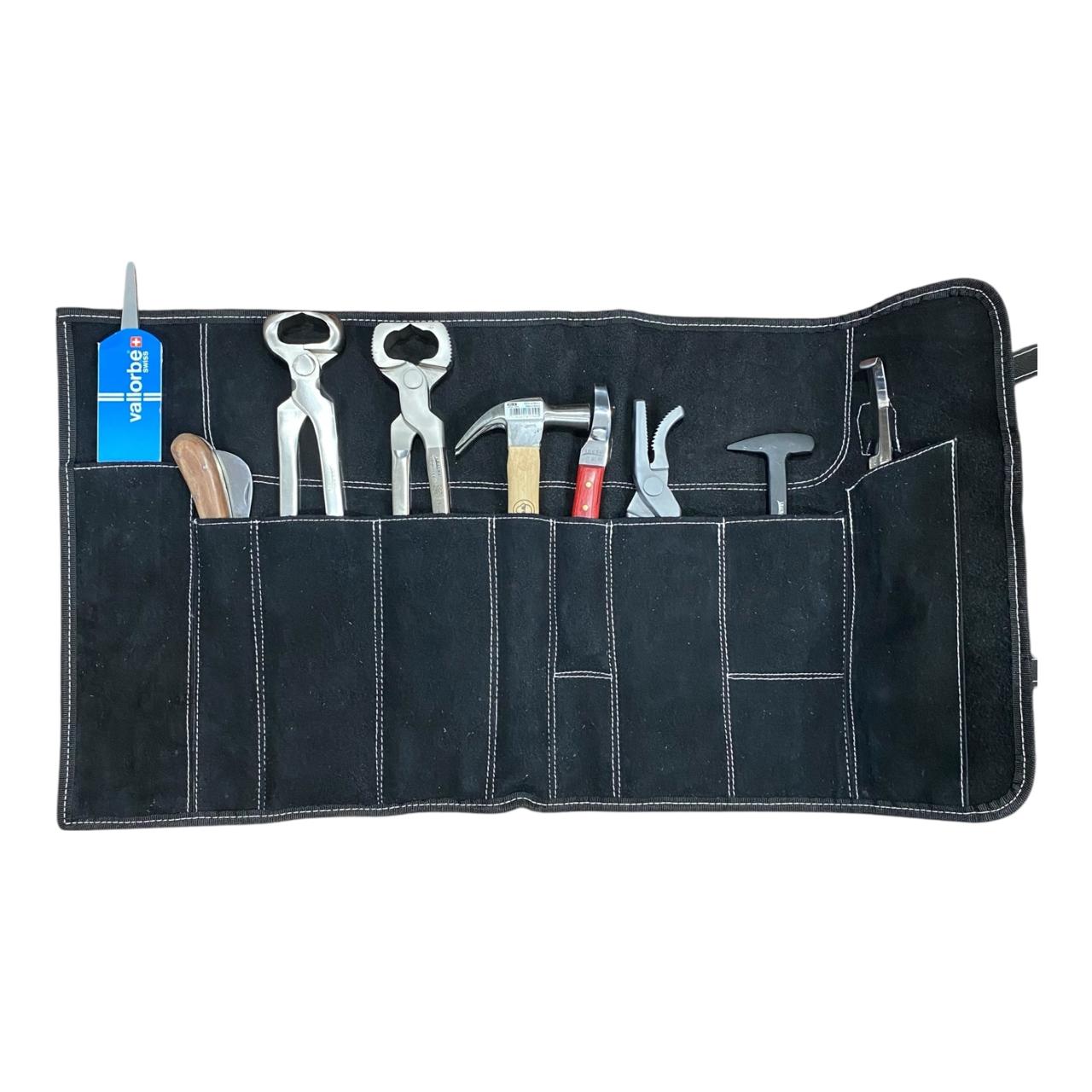 Nuestro kit de herrar está diseñado para satisfacer las necesidades tanto de herradores profesionales como de propietarios de caballos que buscan mantener el bienestar de sus animales. Fabricado en cuero de alta calidad, resistentes y duraderos, este conjunto ofrece las herramientas esenciales para realizar un herraje eficaz, seguro y preciso.