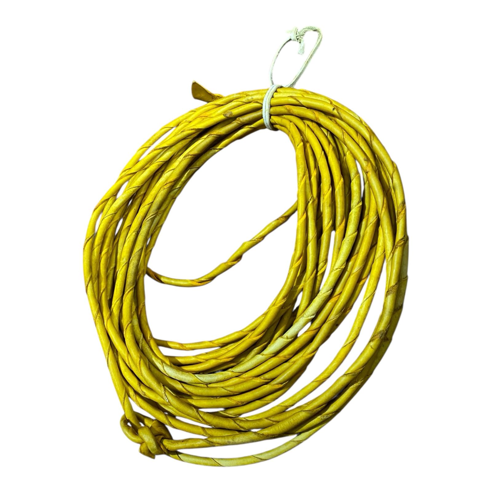 Nuestro mochero es un lazo tradicional, ideal para el trabajo con ganado. Está hecho de cuero crudo trenzado, lo que le otorga una gran resistencia y durabilidad. Su color claro y las marcas naturales en el cuero le dan un aspecto auténtico y rústico. La cuerda está enrollada de forma compacta y sujeta por un amarre, facilitando su transporte y almacenamiento. En un extremo, un nudo resistente asegura un manejo firme y seguro. Es una herramienta esencial para vaqueros y ganaderos, perfecta para cualquier labor en el campo.