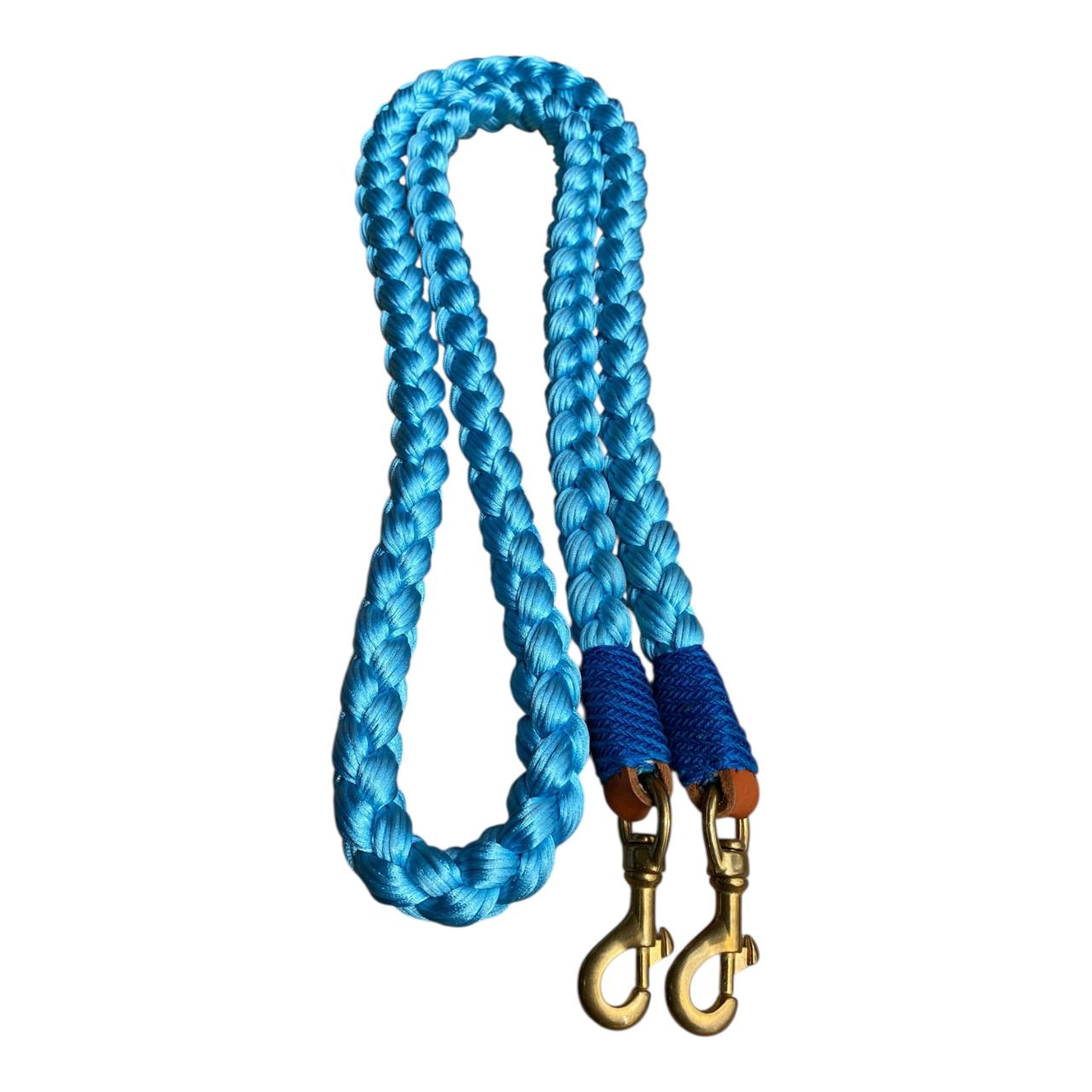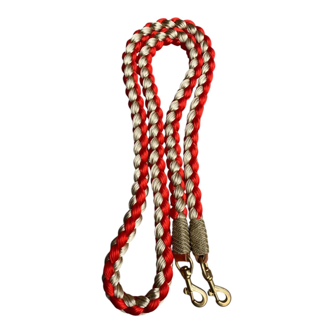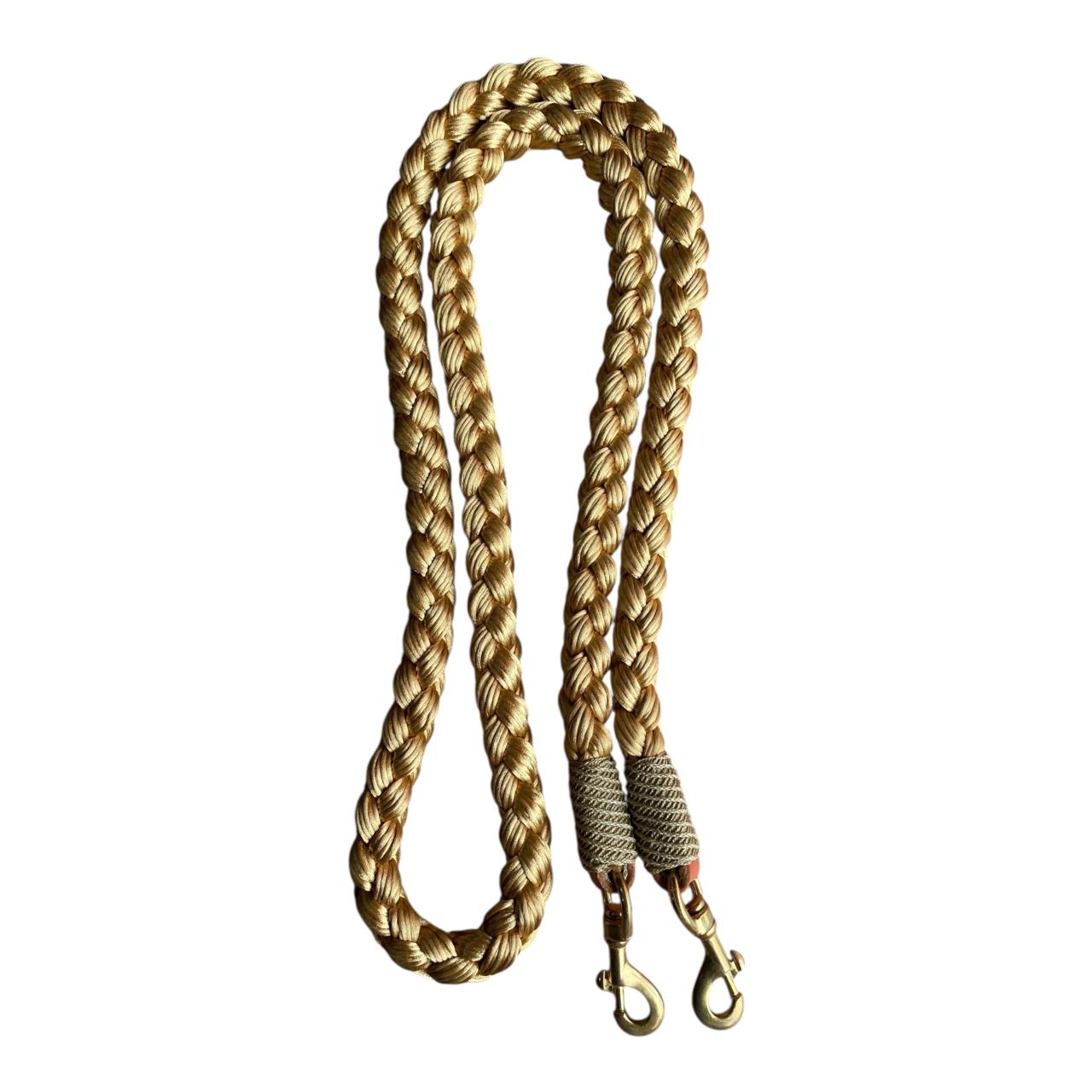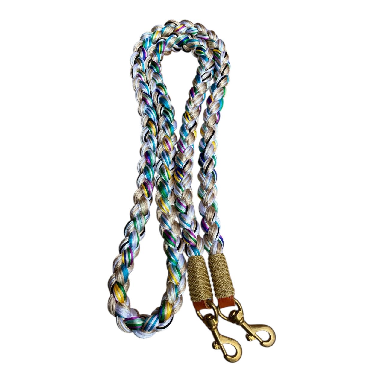 Riendas trenzadas en hilo tipo seda, la textura es muy agradable, con nudos tipo mazorca o nudo tipo tornillo. Todas las riendas vienen con mosquetón. Colores de colección combinados sujetos a disponibilidad.