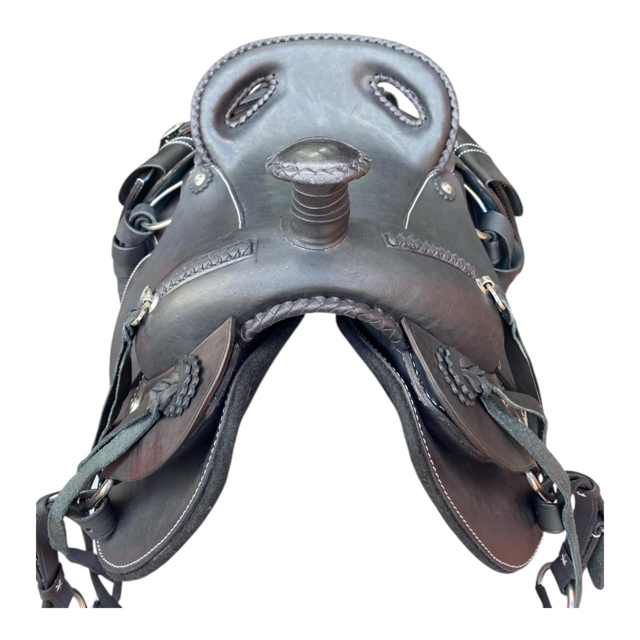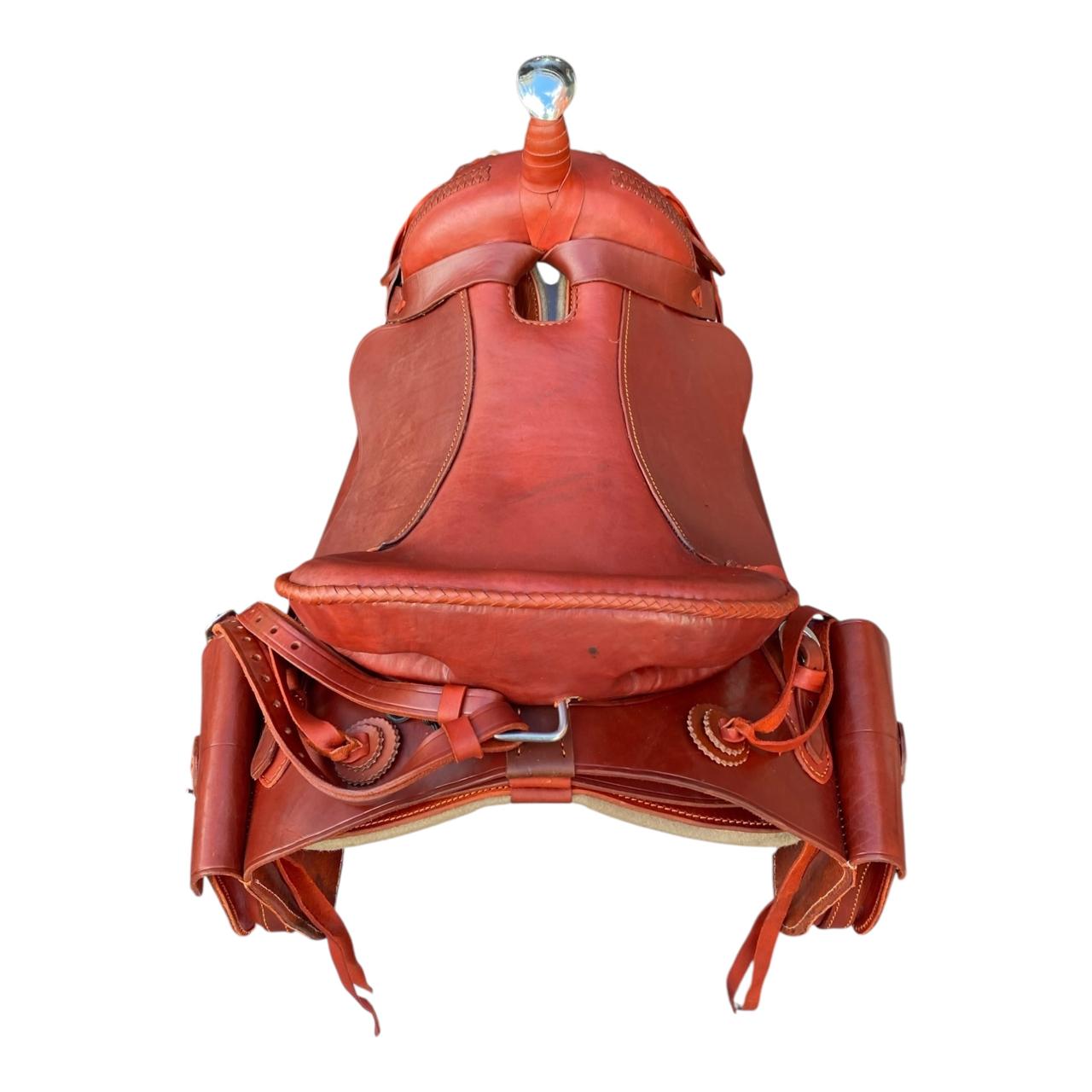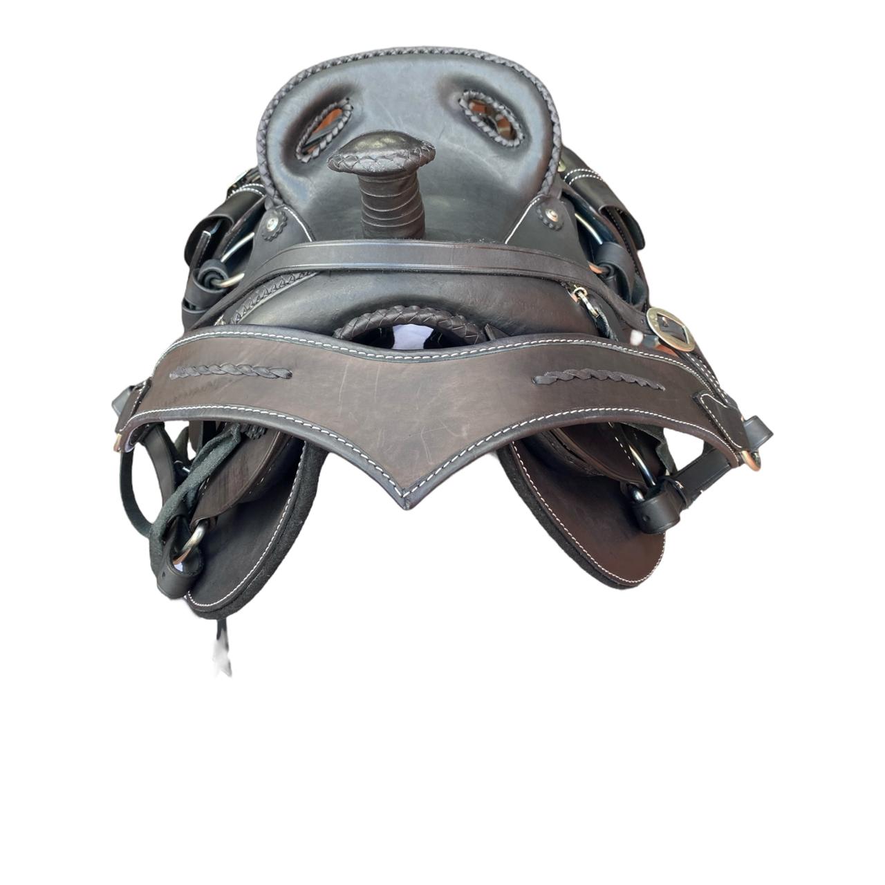 Silla chaparral artesanal en cuero 100% hecha por manos artesanas colombianas. La montura tiene fuste en madera retobado en cuero crudo, cabeza tipo cascabel, forrada en cuero, lindos detalles. La silla incluye guardabarros, estribos, alforjas, pechera, apretadoras en cuero, baticola y cincha.