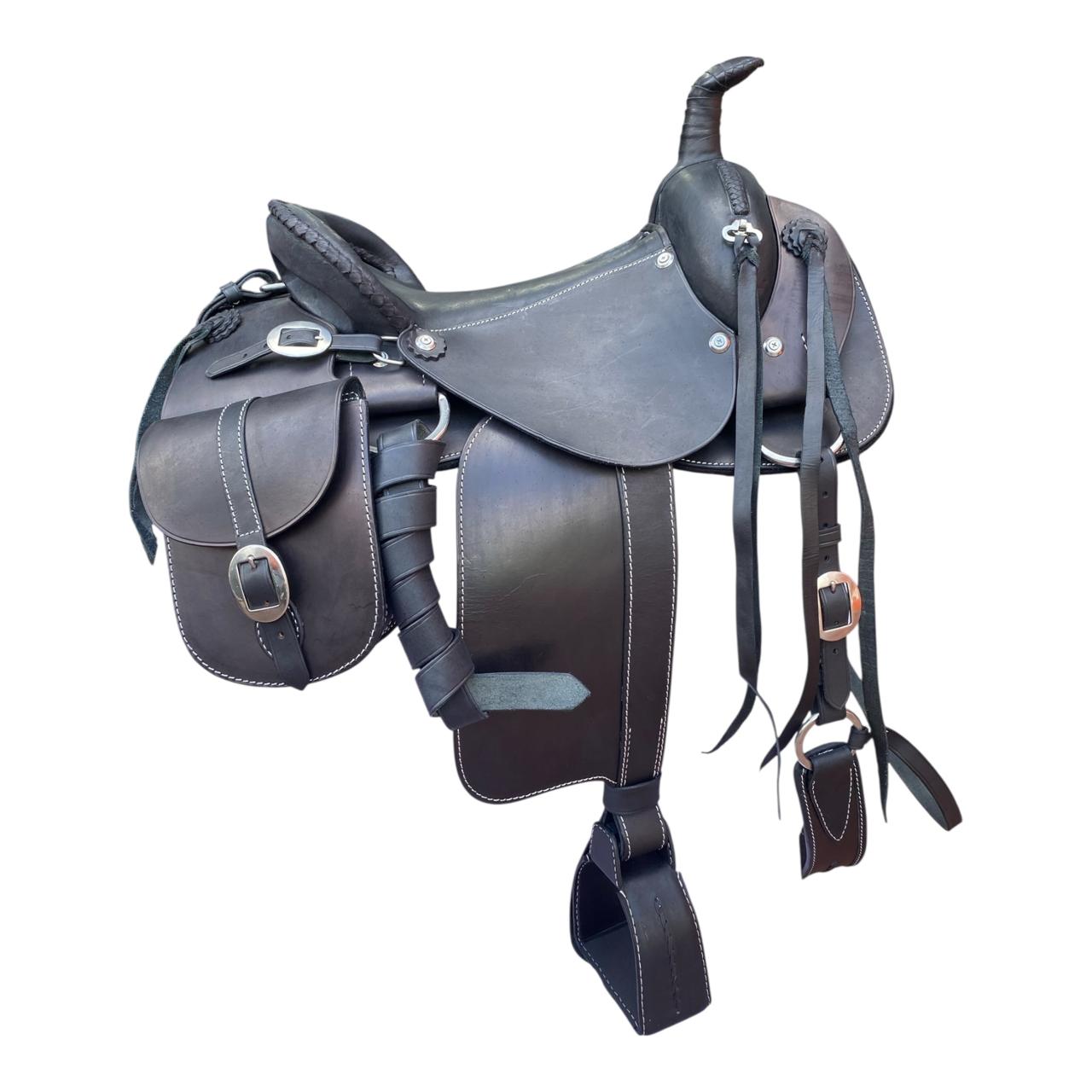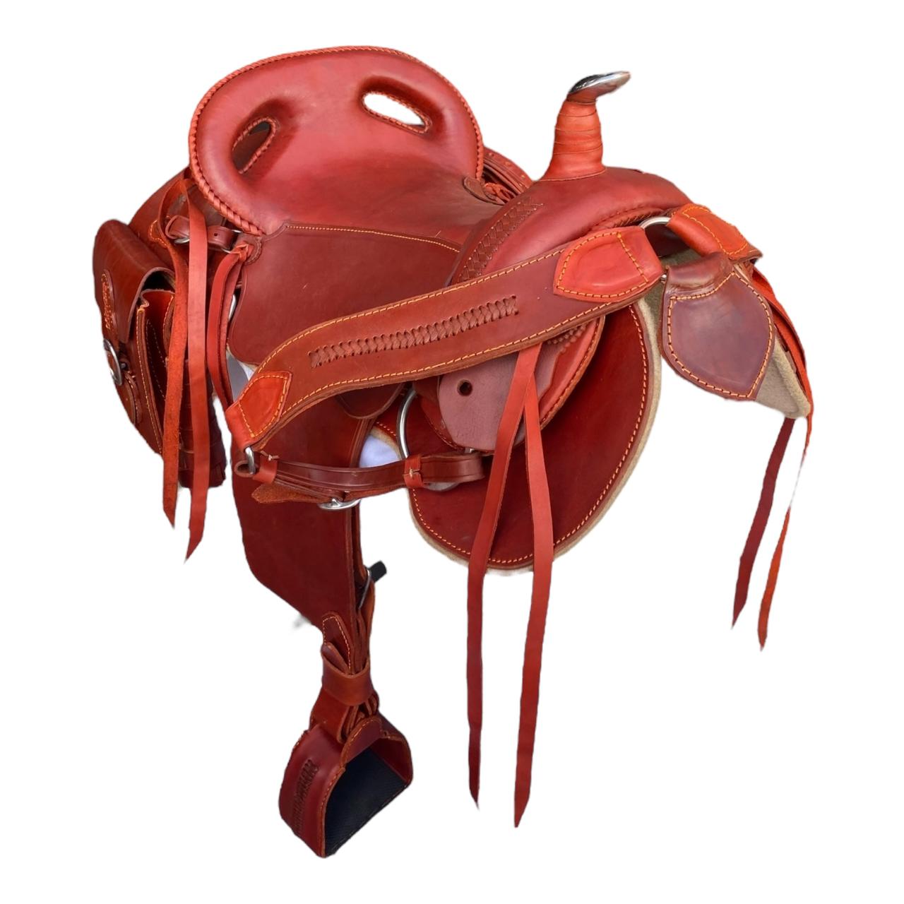 La silla contiene, guardabarros en cuero, estribos en acero forradas en cuero,  pechera, alforjas, apretadoras en cuero, baticola y cincha.