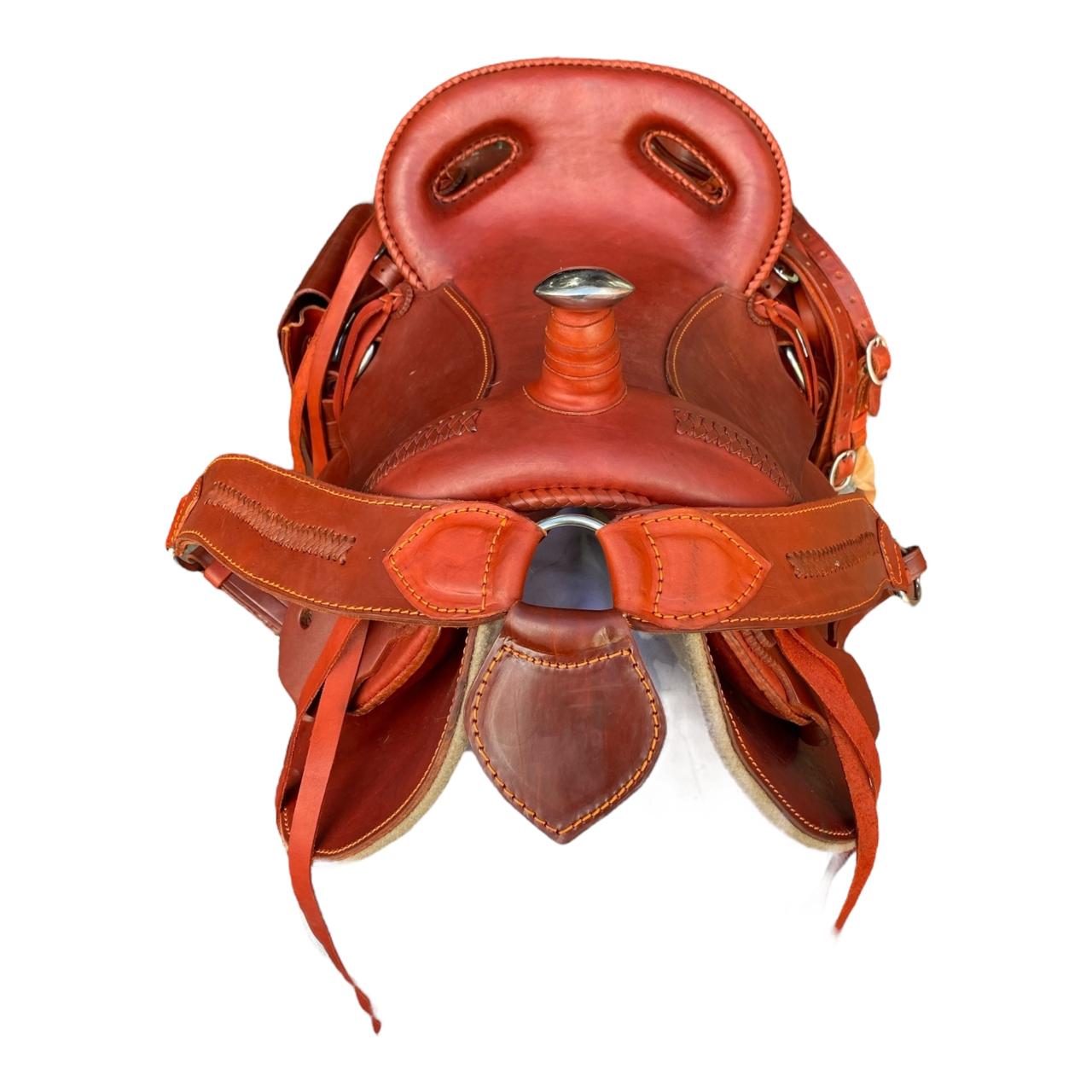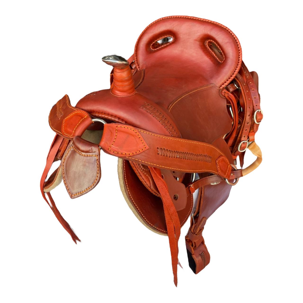Este hermosa silla chaparral es hecha 100% en cuero,  tanto sus accesorios como todo el exterior de la silla, hasta sus bastos.  Está diseñada para pasear o cabalgatear, cuenta con herrajes en acero inoxidable y el asiento tiene un cómodo acolchado pues su interior está compuesto por una espuma de alta calidad. Los tejidos y detalles son hechos a mano con hilo y cuero crudo.