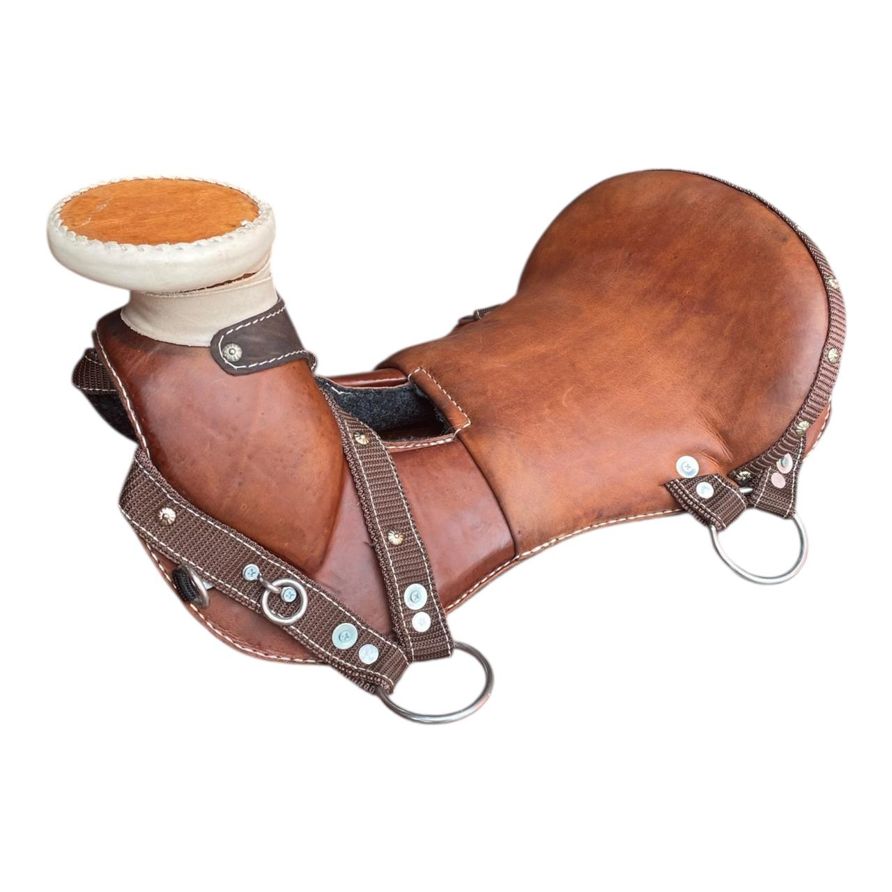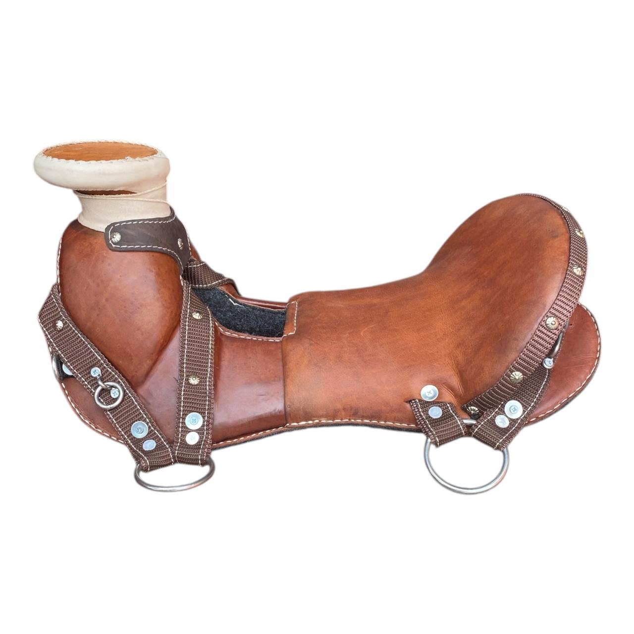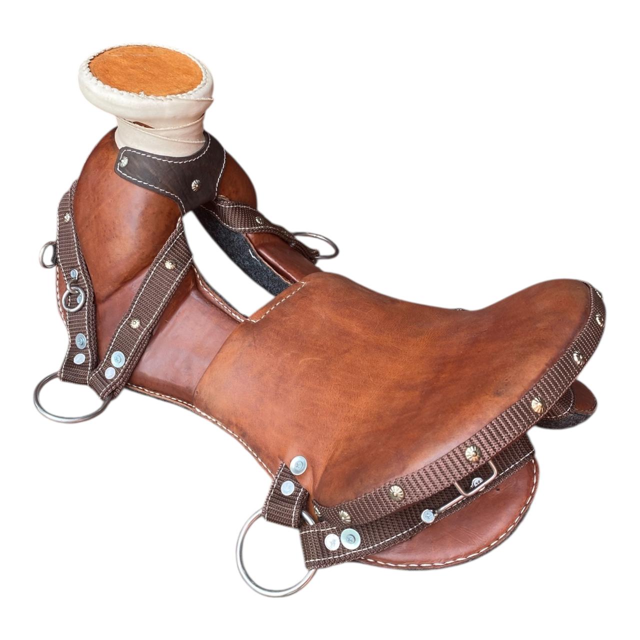 Silla cabezona hecha en cuero, medio asiento con refuerzos en reata, herrajes en acero inoxidable, fuste en fibra de vidrio. Montura ideal para trabajo o vaquería. Elegir opciones. Tenemos dos opciones de compra: Montura sin accesorios.