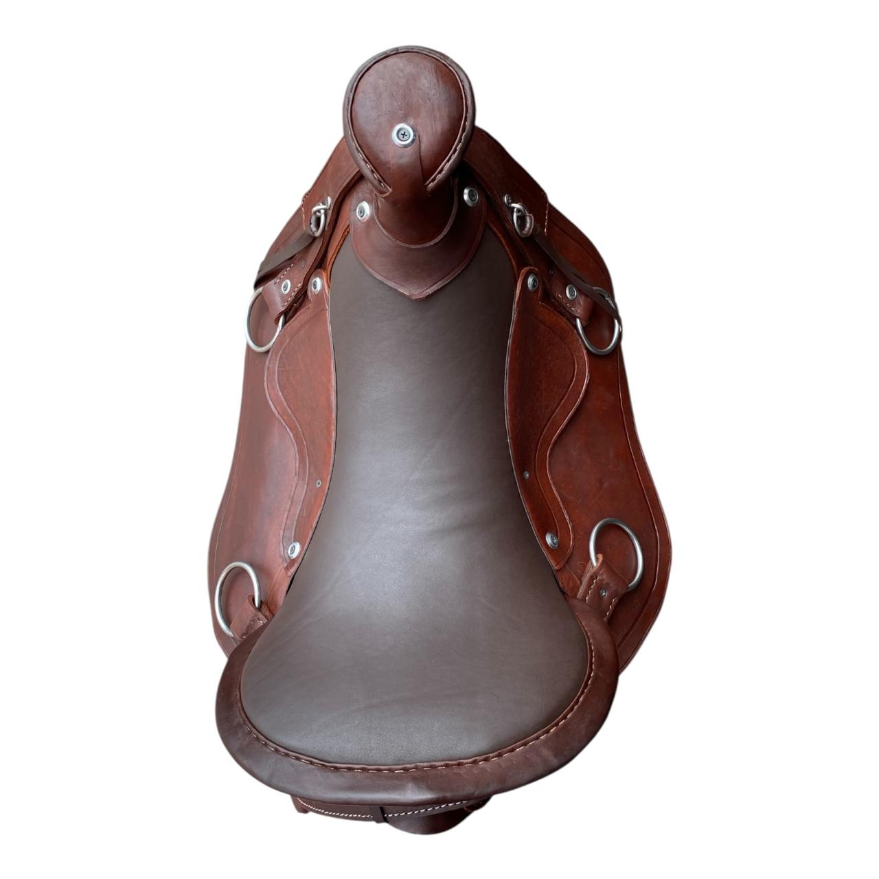 Equipada con argollas en acero inoxidable gruesas y resistentes, ideales para sujetar la cincha, pechera y alforjas.