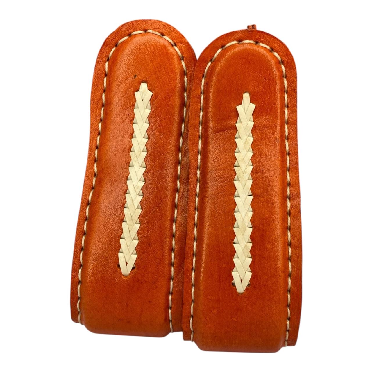 Costura blanca en cuero crudo trenzado resalta el contorno de las tarabas, creando un contraste visual atractivo que realza su diseño y demuestra la solidez de su confección.
