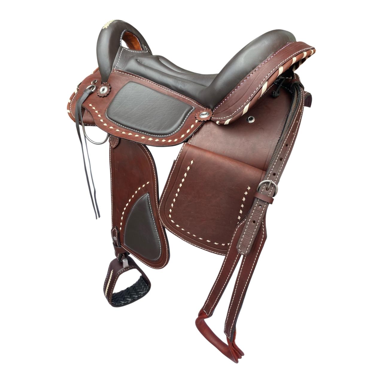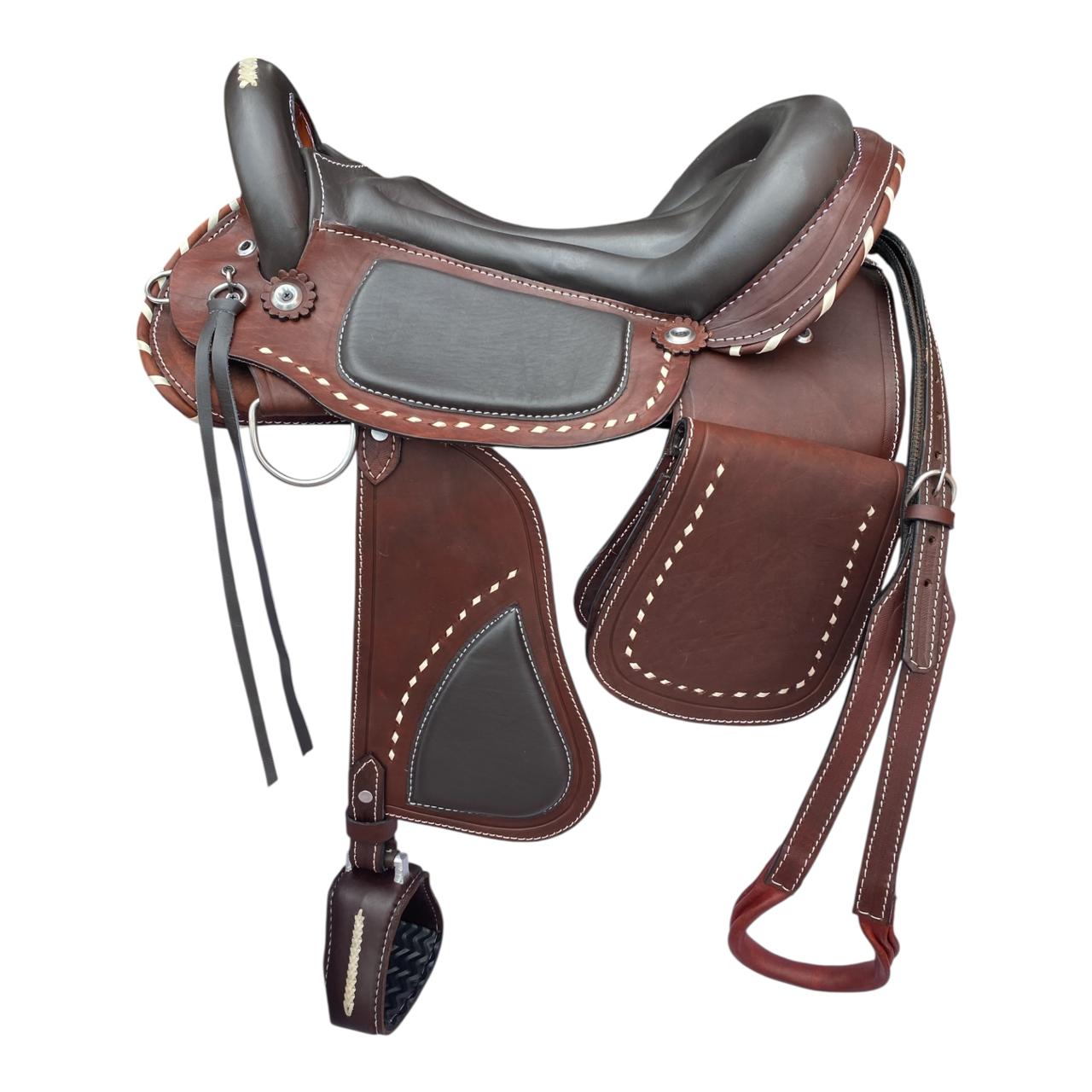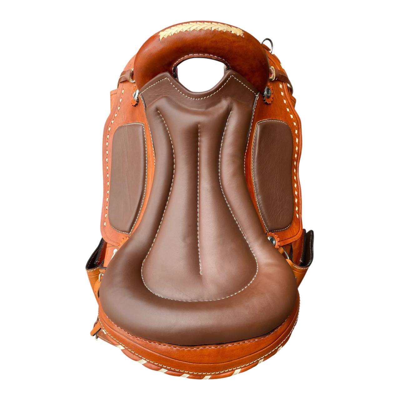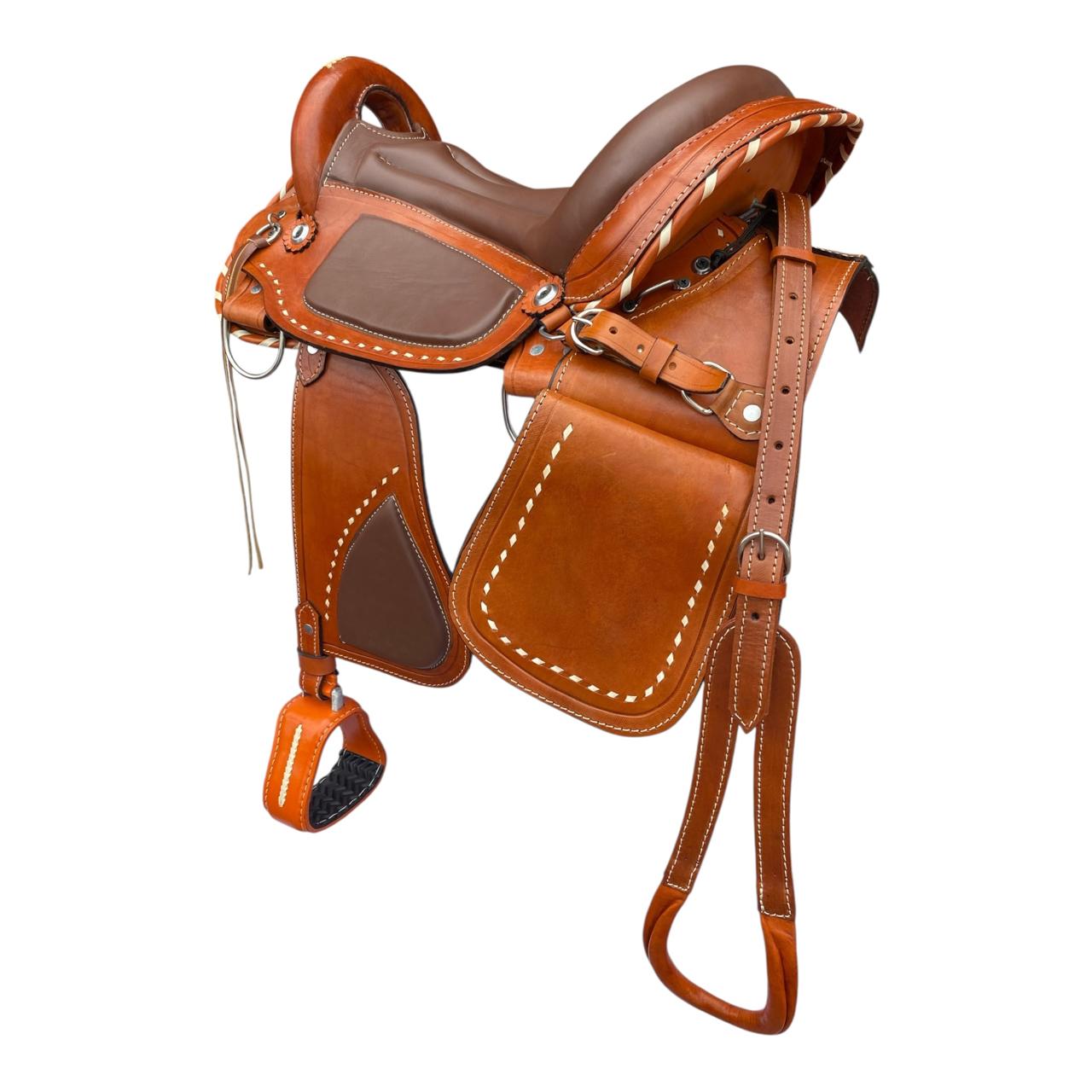 Tereque artesanal abullonado con alforjas hecho 100% en cuero. Su fuste está hecho de madera retobado en cuero crudo, lo que lo hace mucho más resistente. El herraje es completamente en acero inoxidable y el asiento contiene espuma de alta densidad lo que lo hace de gran confort. Viene con guardabarros, estribos,baticola y apretadoras.