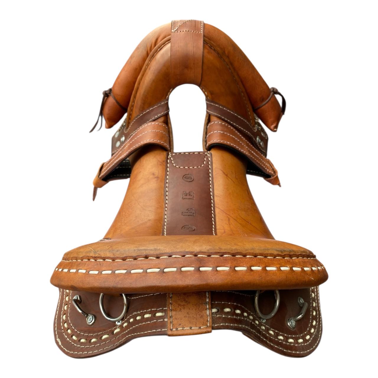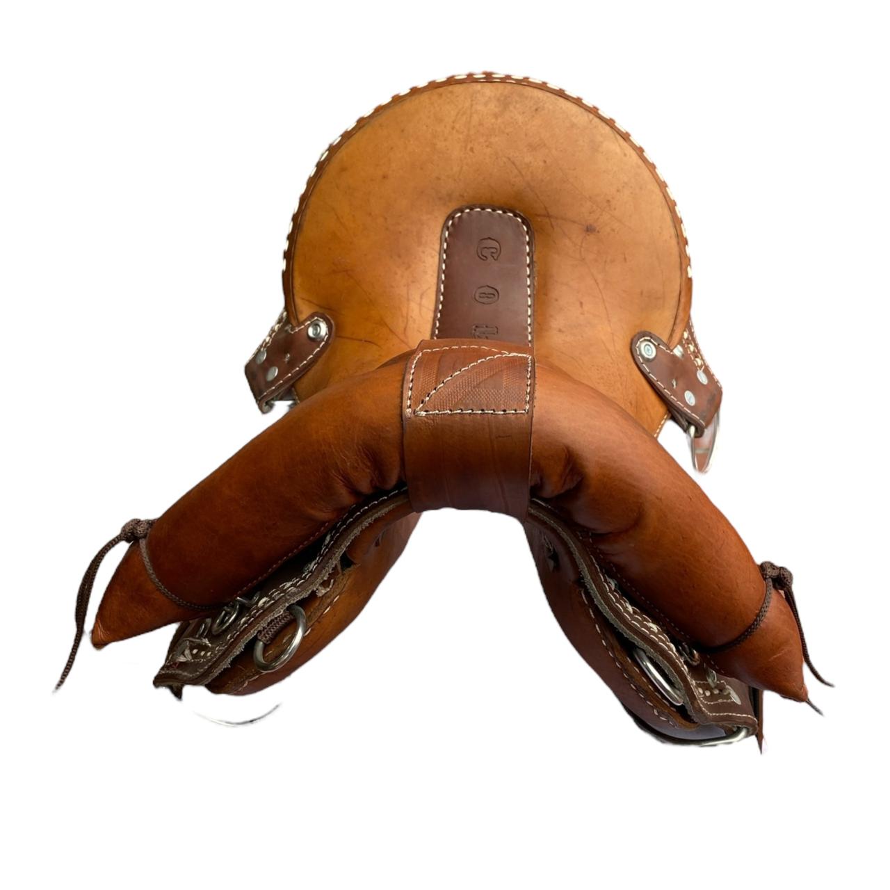 Tereque con fuste en fibra 15″ fabricado en cuero, con muñeco de protección en el aro, cabeza grande tipo mexicana, con herrajes en acero inoxidable.